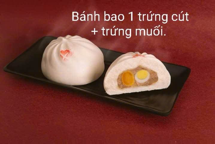 - Mô tả: Bánh bao trắng mềm, nhân thịt tẩm ướp kỹ cùng trứng cút và trứng muối béo bùi — cân bằng giữa vị mặn và ngậy.